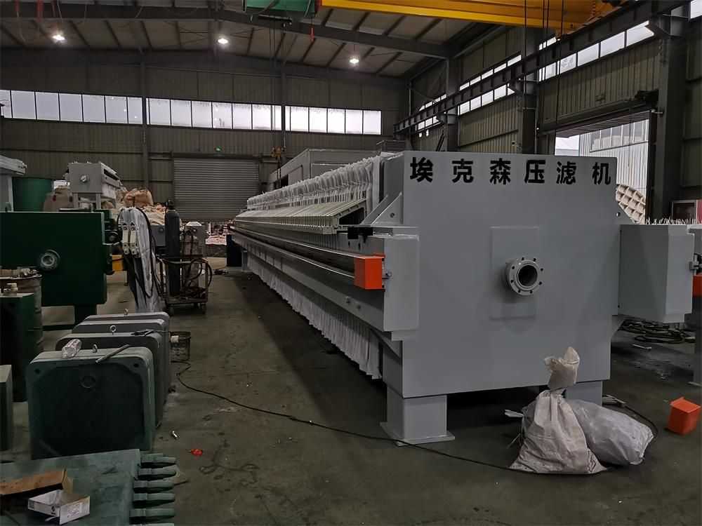 隔膜壓榨壓濾機是由隔膜板和廂式濾板排列組成濾室,在輸料泵的壓力作用下將料漿輸入濾室,通過過濾介質(濾布)將料漿中的固體和液體分離,當料漿中的固體形成餅后,再向隔膜通入空氣,對濾室內的固體充分壓榨。