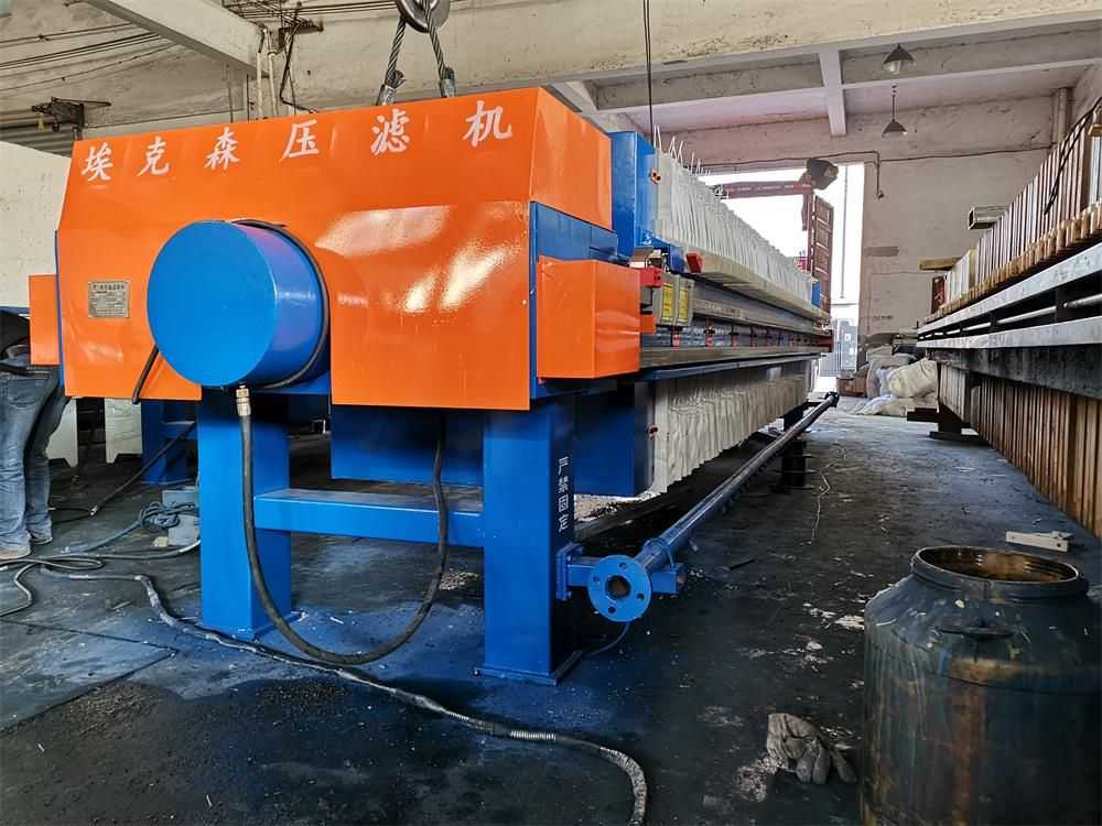 液壓廂式壓濾機由交替排列的濾板和濾框構成一組濾室。濾板的表面有溝槽,其凸出部位用以支撐濾布。濾框和濾板的邊角上有通孔,組裝后構成完整的通道,能通入懸浮液、洗滌水和引出濾液。板、框兩側各有把手支托在橫梁上,由壓緊裝置壓緊板、框。板、框之間的濾布起密封墊片的作用。由供料泵將懸浮液壓入濾室 在濾布上形成濾渣,直至充滿濾室。濾液穿過濾布并沿濾板溝槽流至板框邊角通道,集中排出。過濾完畢,可通入清洗滌水洗滌濾渣。